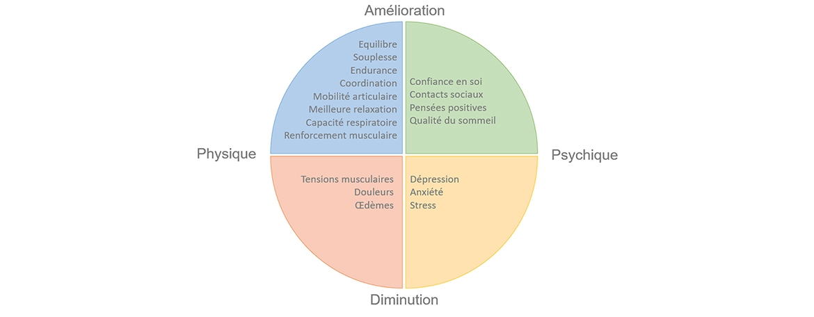 Grâce à la stimulation des défenses immunitaires par le mouvement, les activités physiques contribuent à constituer des réserves énergétiques favorisant ainsi l’augmentation de la vitalité et la diminution de certains effets secondaires.